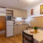 A kitchen features a microwave oven, a refrigerator, and kitchenware for self-catering. Brnik airport is also located 60 km from Apartments Kocjanc. Guests may also engage in activities such as hiking, horse riding, and skiing.